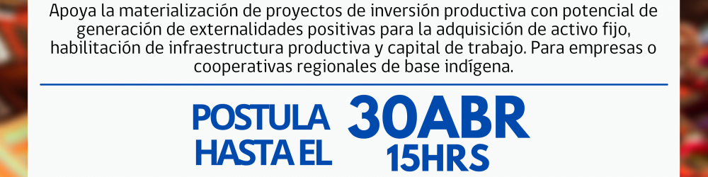 A través de esta línea de financiamiento se entrega un monto máximo de $35 millones, cofinanciando el 70% del proyecto, y este último debe ser igual o superior a $10 millones. Además, los postulantes deben presentar el certificado emitido por Ia Corporación Nacional de Desarrollo Indígena — Conadi, donde se compruebe y acredite que está conformada por personas naturales que tengan la condición de indígena.